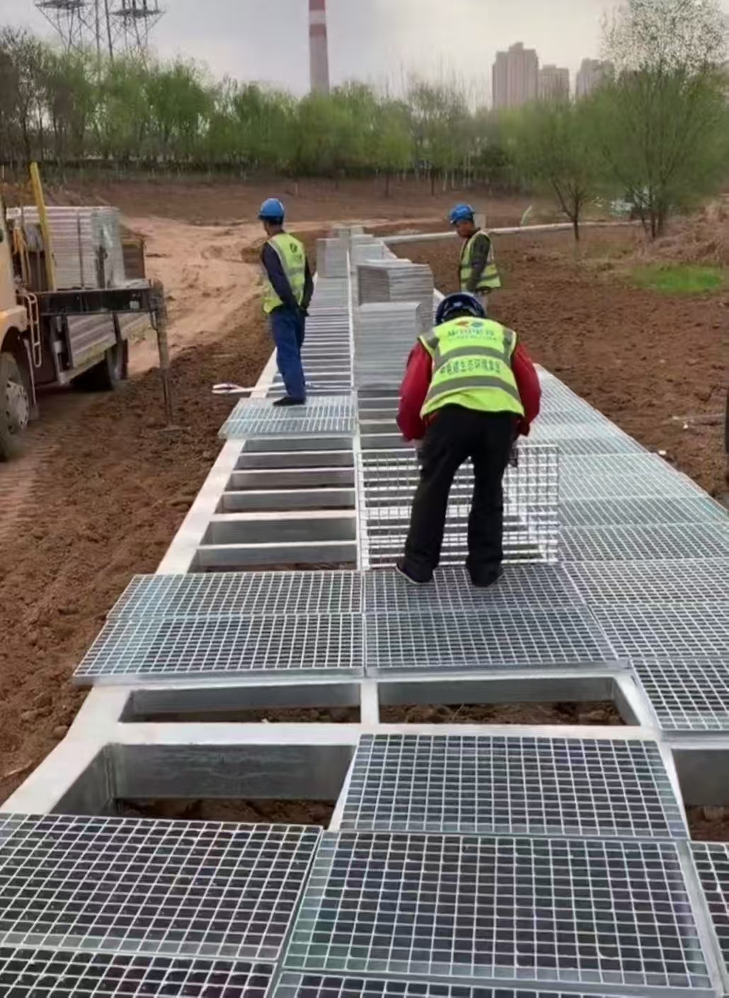 热浸镀锌: 将焊接好的钢格栅整体浸入熔融的锌液中,使表面形成一层较厚(通常50-80μm以上)、结合牢固的锌铁合金层和纯锌层。这是最常见、防腐效果最好、性价比最高的方式。