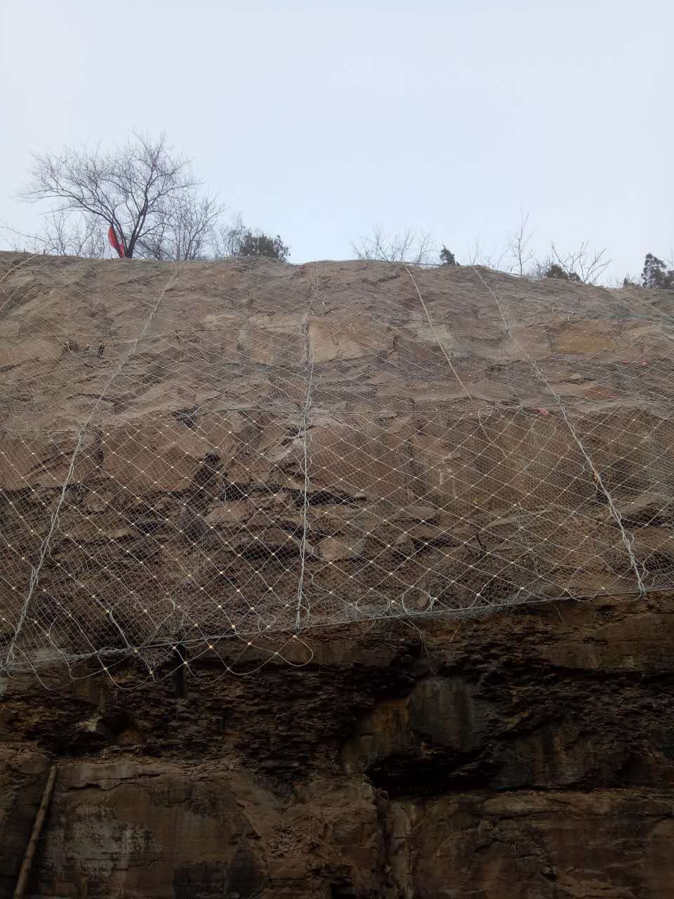 防护网-主动防护网。钢丝网铺设覆盖包裹在所需斜坡或岩石上,再用钢丝绳与锚杆网加固。以限制坡面岩石土体的风化剥落或破坏以及危岩崩塌(加固作用),或将落石控制于一定范围内运动(围护作用)构造。